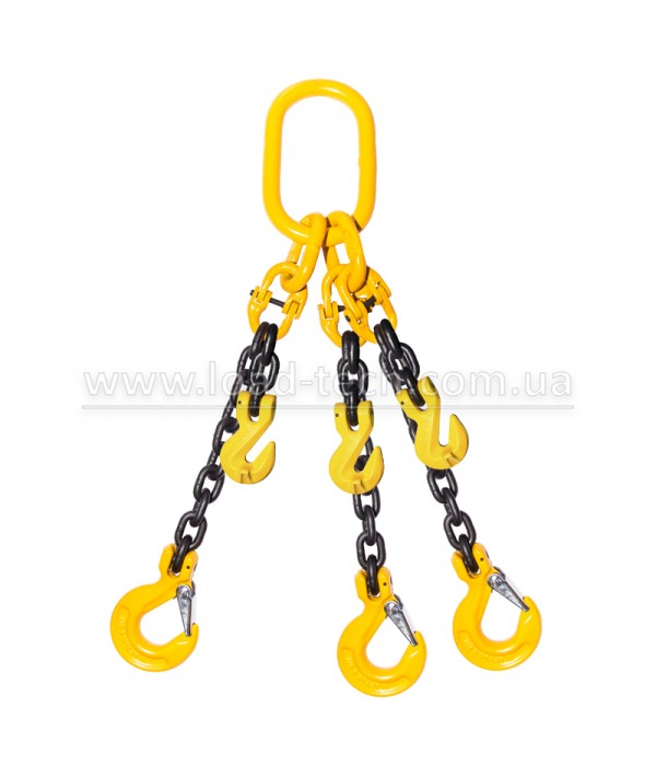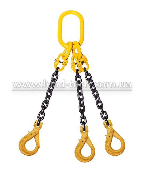 Цепной трехветвевой строп (3СЦ) – грузоподъемное приспособление, состоящее из 3 ветвей с крюками, главного и дополнительных овальных звеньев. По желанию заказчика, стандартные крюки заменяются самозапирающимися крюками, комбинацией фитингов или доукомплектовуются ограничителями ветви. Для производства применяются комплектующие G80.